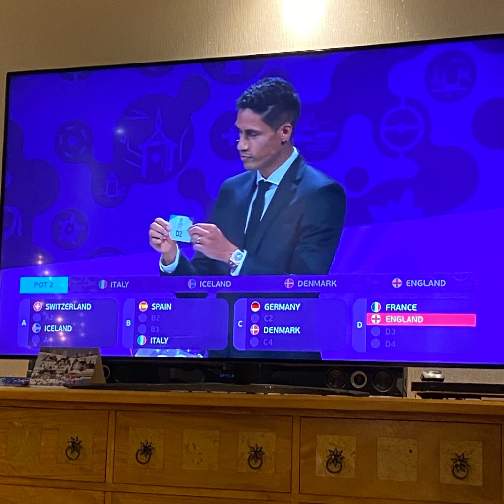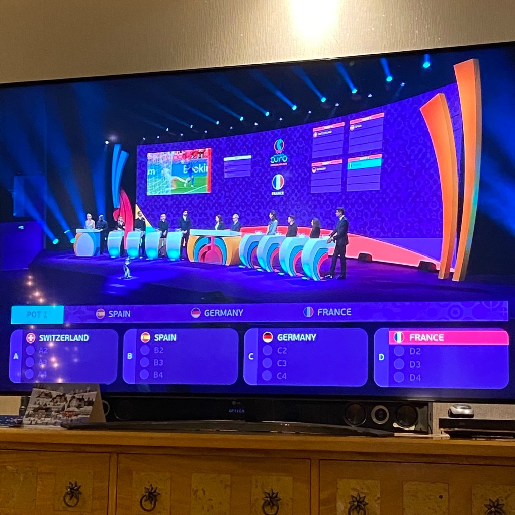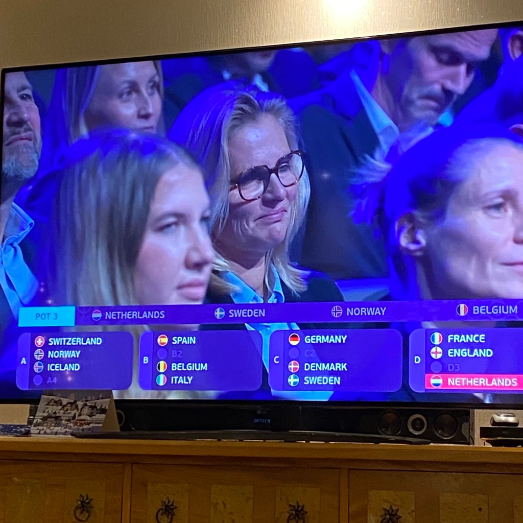 Balls keep popping out and soon we see “ENGLAND” held aloft. The family are excited as England are placed into Group D along with France. Our Lionesses are allocated position D2. I take another shot of the television and text Liam.