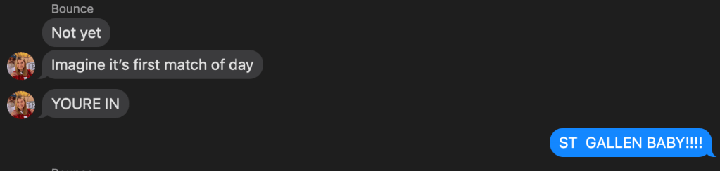 My message to the group arrives at the same time. “ST GALLEN BABY!!!!”