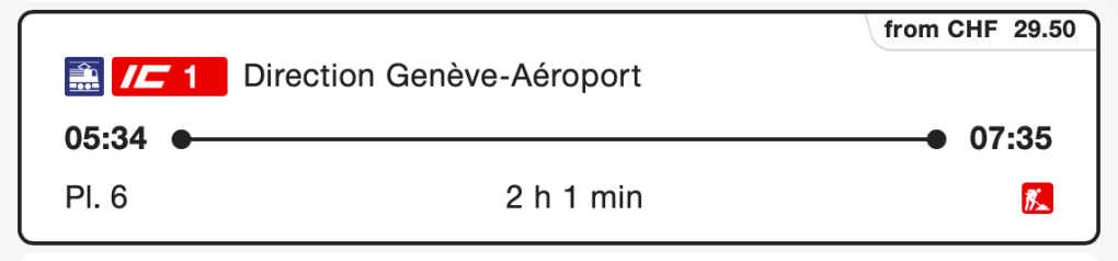 We checked the SBB website this past Saturday; that was when tickets became available for Saturday July 12th – the final day of our Euro adventure. All looked good. The site displayed the departure time we wanted (0534) and the train’s arrival at Genève-Aéroport at 0735. It told us the train number (IC1) and that it would leave from platform 6. All excellent information to know. At such an early hour, armed with these details, Liam and I would be able to stagger, bleary-eyed, safely to where we needed to be.