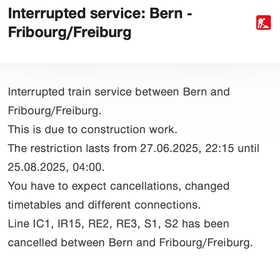 Our train, the IC1, was a service specifically mentioned as being cancelled between Bern and Fribourg/Freiburg (a station slightly less than quarter of the way to Geneva) due to construction work. Horrifyingly, it went on to mention the three words most certain to cause fear in the minds of every rail-user; replacement bus service.
