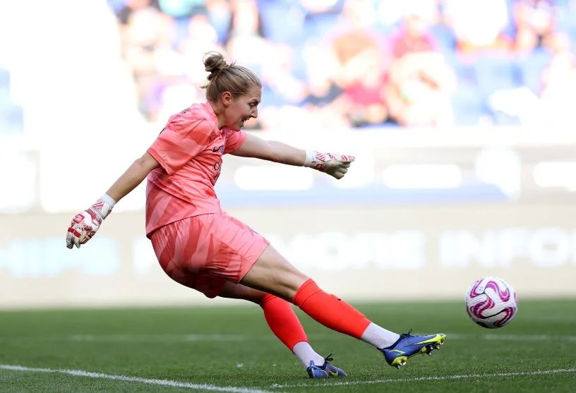 Ella had a magnificent game in the derby match. Keating, an up-and-coming Lioness starlet herself, didn’t fare so well. Interestingly, Keating – like Toone a Manchester-born lass – initially started out as a striker before signing, aged six, as a goalie with United. At eleven, she moved to the City academy. I look forward to seeing Keating improve and learn from her performance in this derby. She had a terrific season in 2023-24, winning the Golden Glove as the best keeper in the WSL. Her performances last year also earned her a senior international call-up from Sarina Wiegman. I am certain Keating will go on to be a regular in goal for The Lionesses in the near future. Though I suspect this year’s Euros may be a tournament too early for her. Wiegman might include her in the squad as third choice keeper behind Mary Earps (ex-United, now at Paris Saint-Germain) and Chelsea’s Hannah Hampton, although the inclusion of twenty-nine year-old Anna Moorhouse (Orlando Pride) in recent friendly squads may suggest otherwise. Another Lioness keeper, Ellie Roebuck (ex-City, currently at Barcelona), is returning after a year out of the game following a stroke and, when fully back, will, I hope, be vying for her England shirt once more.