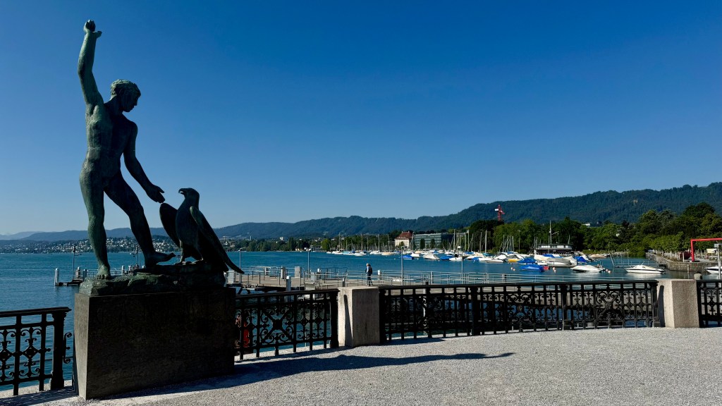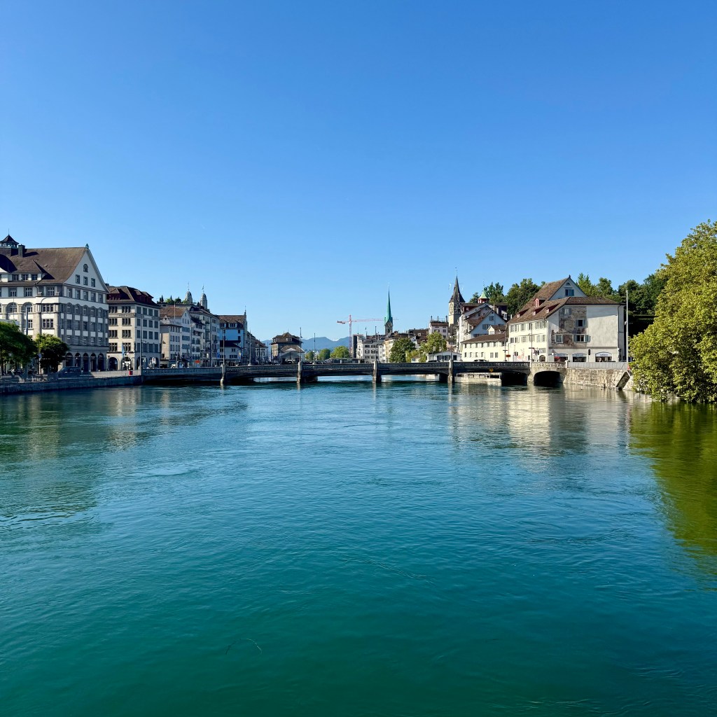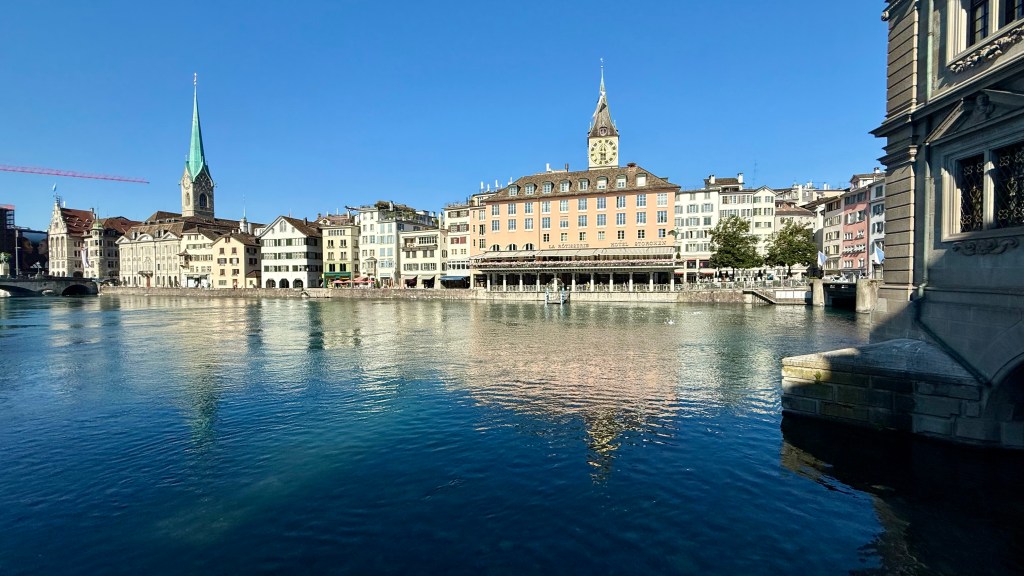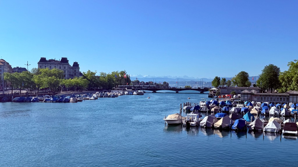 We take a leisurely stroll – it is far too warm to dash about! – and head for the southern end of the city. The Limmat flows northwesterly from its source at Lake Zurich before joining the river Aare downstream. (The Aare is a stretch of water where – unknown to us at this stage – #SonInLawNo1 and I pass a pleasant hour later during our trip. More of that when I get to Day 3.)