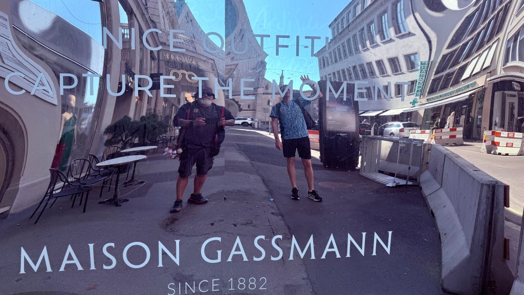 We leave the apartment shortly before 0800. I offer Liam a slice of the small loaf of rye bread (Lidl’s finest) which I thought would be an ideal size to pack and would help sustain us if it proved too costly to eat in Switzerland! We munch contentedly as we head to Bahnnof Opfikon to catch a train – not one of those pesky and elusive trams – into the city centre.