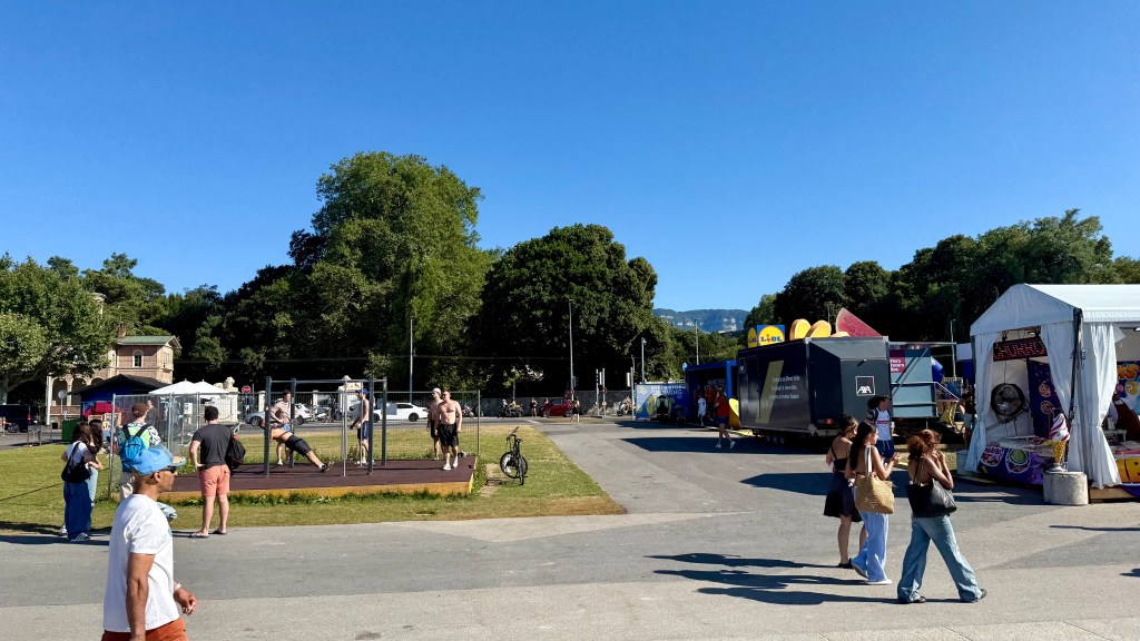 We consider heading for the start of the “fan walk”. Yesterday’s Oranje Walk was so good (so good) that we want to experience a similar atmosphere again, this time with the Swiss and Finnish fans. But we are unsure where the fan walk starts from. We spot two Euro 22 “helpers” and ask their assistance. It seems that the walk will set off from close to our hotel and akes about 45 minutes to reach Stade de Genève.