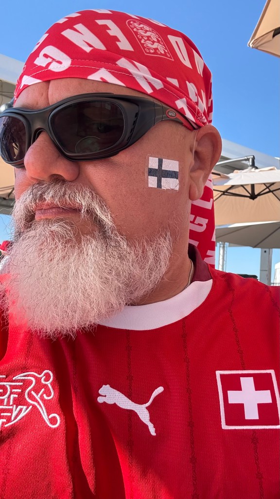 #SonInLawNo1 and I spot a Lidl tent and are grateful to be handed another of their delicious and refreshing fruit bowls. We visit a Finland stall and I agree to having a small Finland flag decal transferred onto each cheek. As a result of this addition to my “look” for the match, I get many curious glances from folk who cannot work out which team I am supporting; the England pirate headgear, the Switzerland shirt and, now, these Finland flags have them perplexed.
