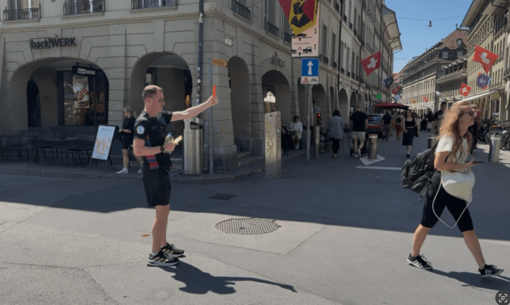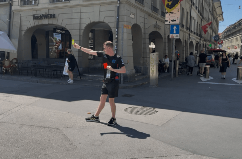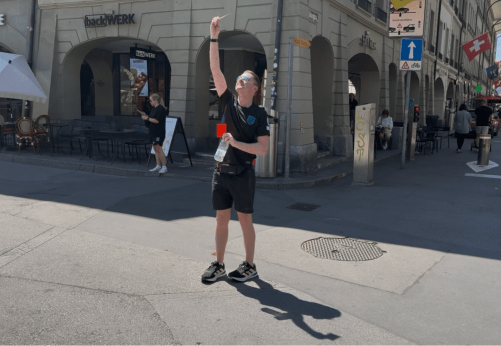 Liam is in his element. He’s off around one corner of Corner Waisenhausplatz with his cards. He’s carding everything he spots; passers by, buildings, street signs. He even thrusts his arm towards the sky and books the sun.