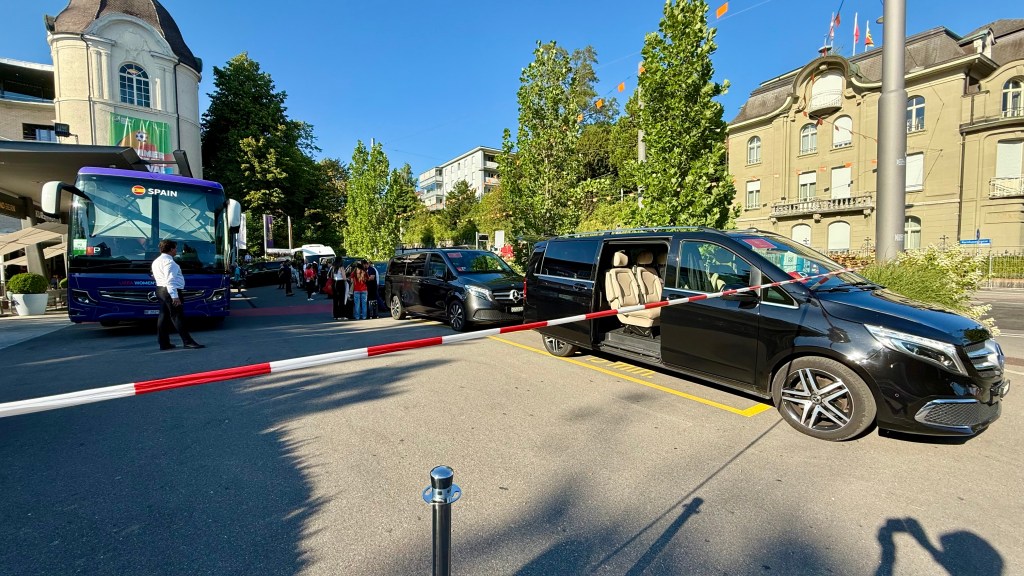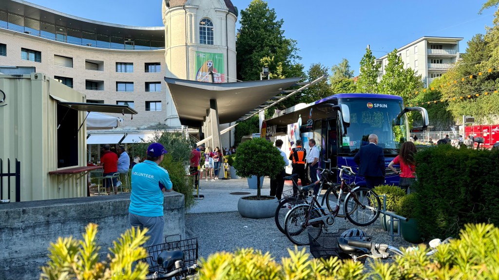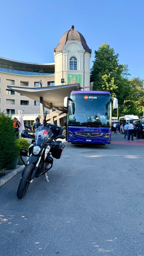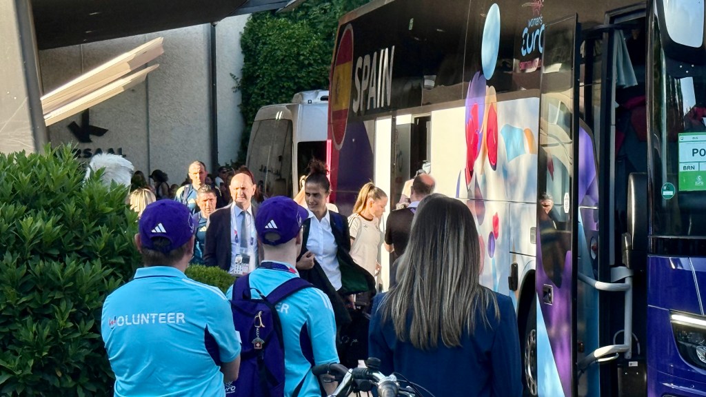Something is afoot, I think. Then I notice that the coach is bedecked in UEFA Women’s Euro 2025 livery and graphics. In large white letters on its dark windows is a single word. “SPAIN”.